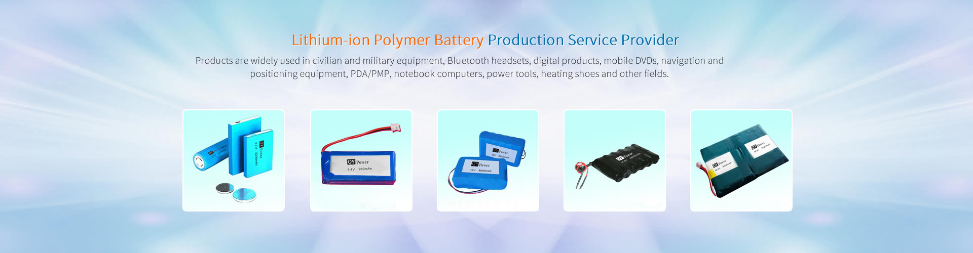Shenzhen Qingying Electronics Co., Ltd. was established in 2005. It is a high-tech private enterprise specializing in R&D, production and sales of lithium-ion polymer batteries and batteries. The main products are polymer batteries, bluetooth batteries, voice recorder batteries, MP3/MP4 batteries, GPS batteries, mobile phone / walkie-talkie batteries, DVD batteries, laptop batteries, power vehicle batteries, model aircraft batteries and various specifications of combined batteries. Used in civilian and military equipment, Bluetooth headsets, digital products, mobile DVD, navigation and positioning equipment, PDA/PMP, notebook computers, power tools, heating shoes and other fields. The company is equipped with advanced lithium battery cell production workshops, SMT patch production workshops and lithium battery protection board production workshops. The products have successively p...
